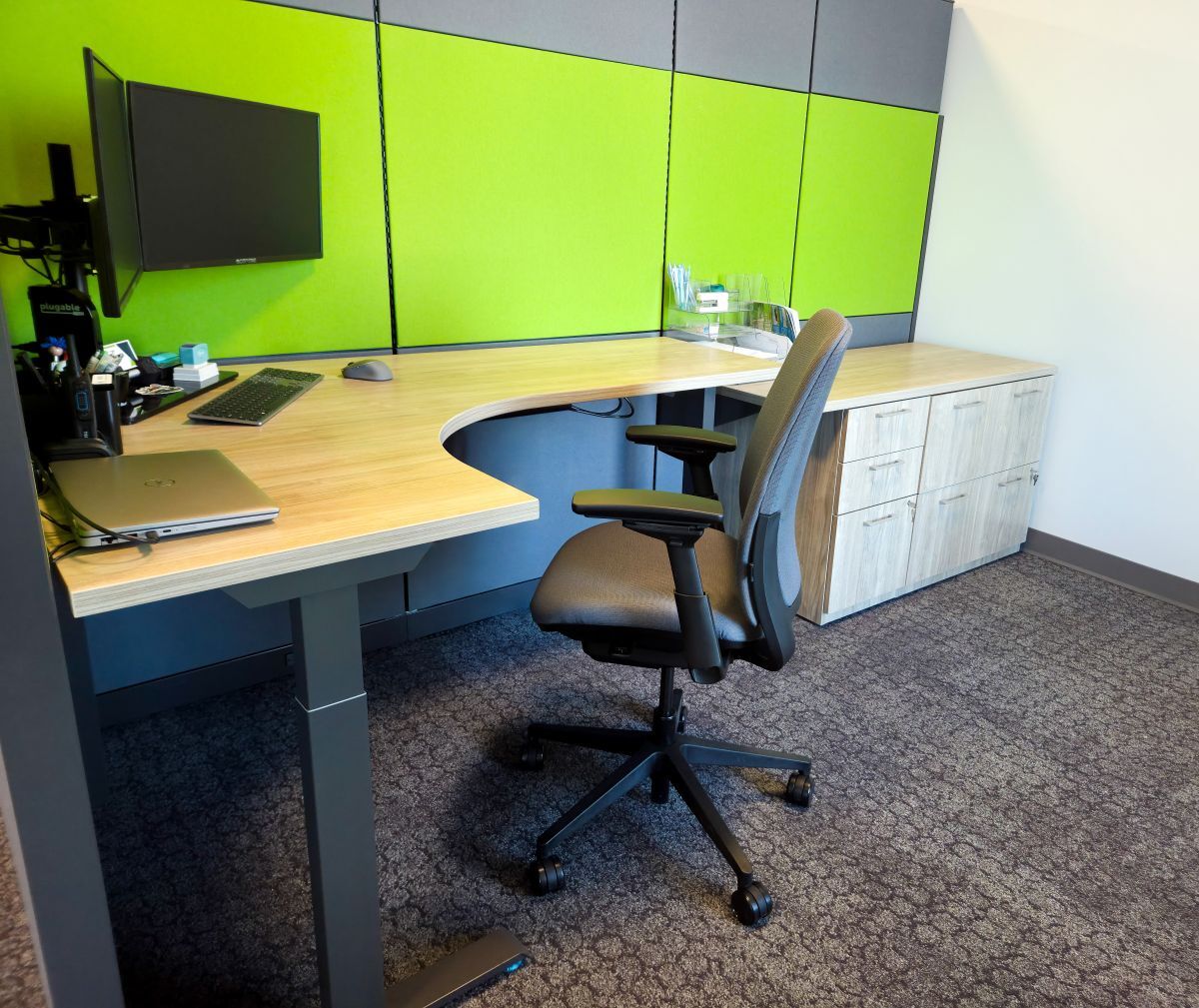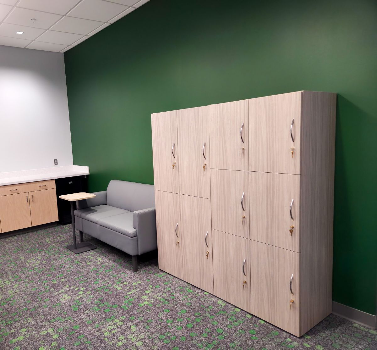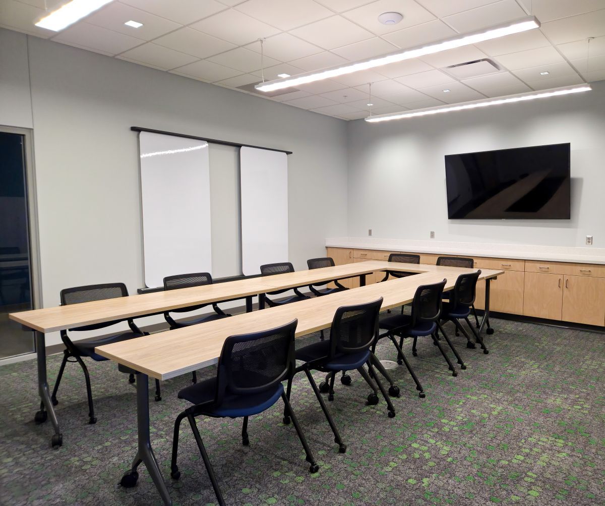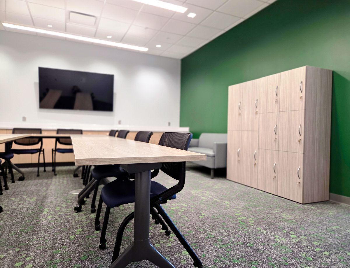 HON Abound cubicles and Concinnity desking were installed to allow for future reorganization. Along spectator corridors, we used Global pedestal seating alongside flexible HON Flock and Steelcase Circa lounge seating, paired with OFS Mobile Power Charging Stations for easy team huddles and waiting. The public sitting area was equipped with reconfigurable HON Tangram tables for easy movement. Finally, the conference room utilized flip/nest tables and nesting chairs and Steelcase Flex Wall Rail whiteboards, along with secure lockers for tournament officials.